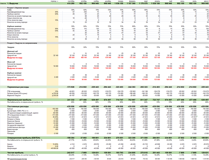 Когда все расчеты завершены, у нас появляется полное понимание того, какие расходы бизнес будет нести для реализации целей по наполняемости и прибыли. Какая у данного проекта точка безубыточности. Какой срок возврата инвестиций.