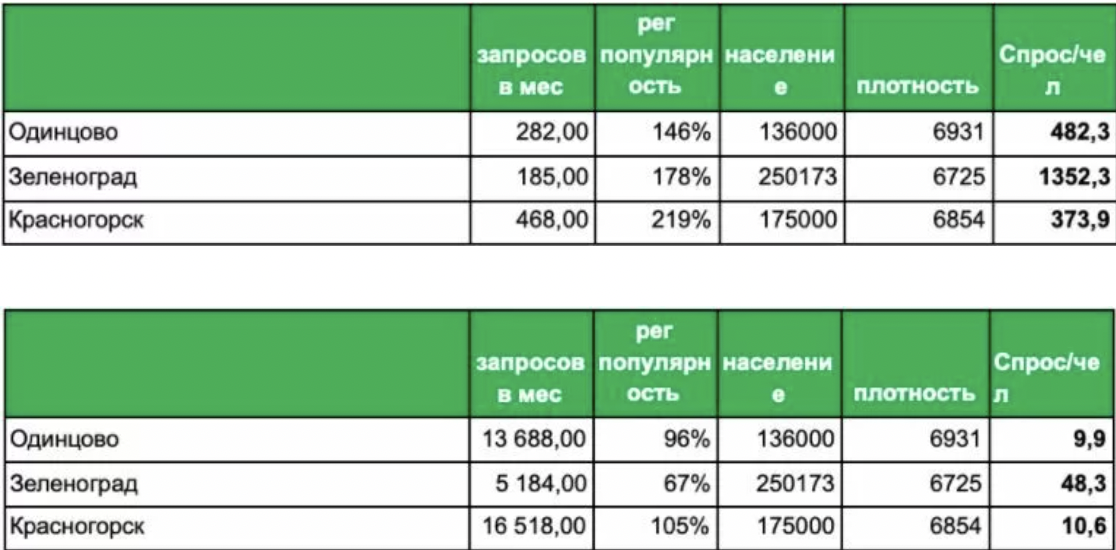 На текущий момент в очереди – 7,1 тыс. детей.2. Количество запросов по фразам «Частный детский сад» и «Детский сад» в Wordstat Yandex по Красногорску выше, чем в Одинцово и Зеленограде (города сопоставимы по плотности населения и расположению относительно Москвы):